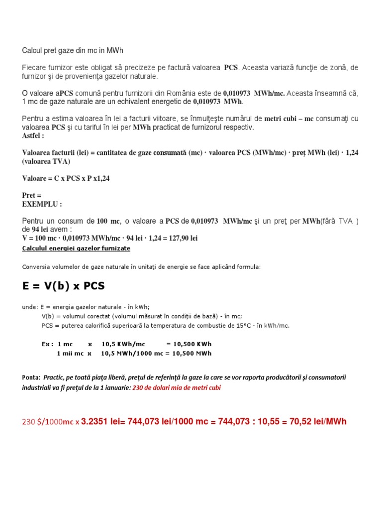 Calcul Pret Gaze Din Mc In Mwh