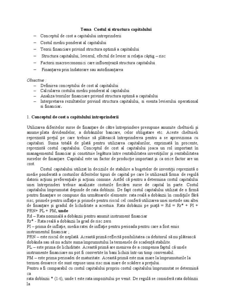 Extras din document. Costul mediu ponderat al capitalului wacc este o valoare financiară care arată costul total al capitalului rata dobânzii plătite pentru fondurile utilizate pentru operațiunile de finanțare pentru o firmă. Costul mediu ponderat al capitalului. Piaţa financiară naţională sau internaţională oferă întreprinderilor o gamă complexă de mijloace de finanţare.